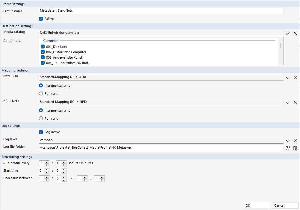 Die Metadaten-Synchronisation mit NetX wird über das Profil NetX: Meta synchronisation im BeeCollect Media Client bzw. nach Verfügbarkeit im Modul Profile und Jobs in BeeCollect Professional konfiguriert.